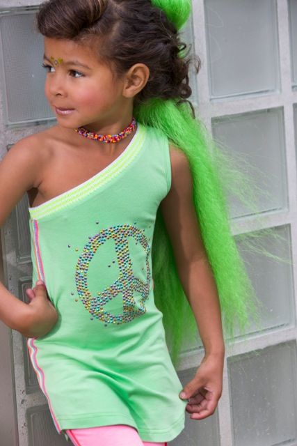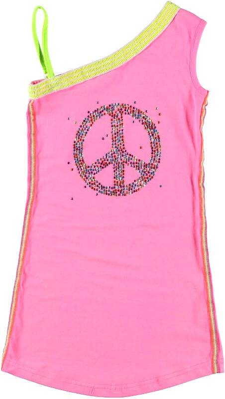 Kleur: roze. De bovenrandvan het jurkje is elastisch met neon gele accenten.Het peace-teken is uitgevoerd in kleine metalen glinsterende studjes in allerlei kleuren.