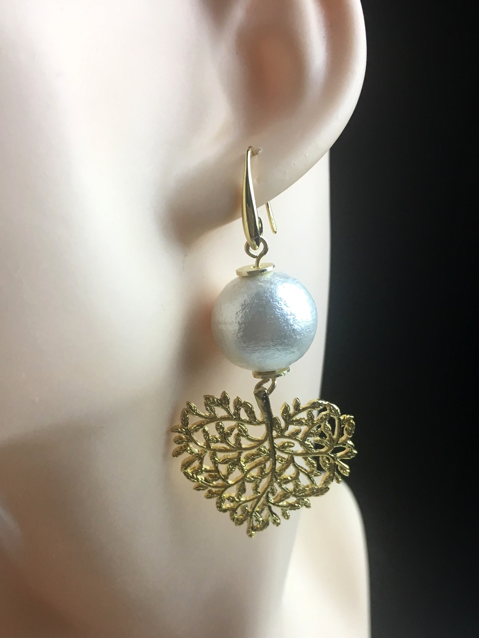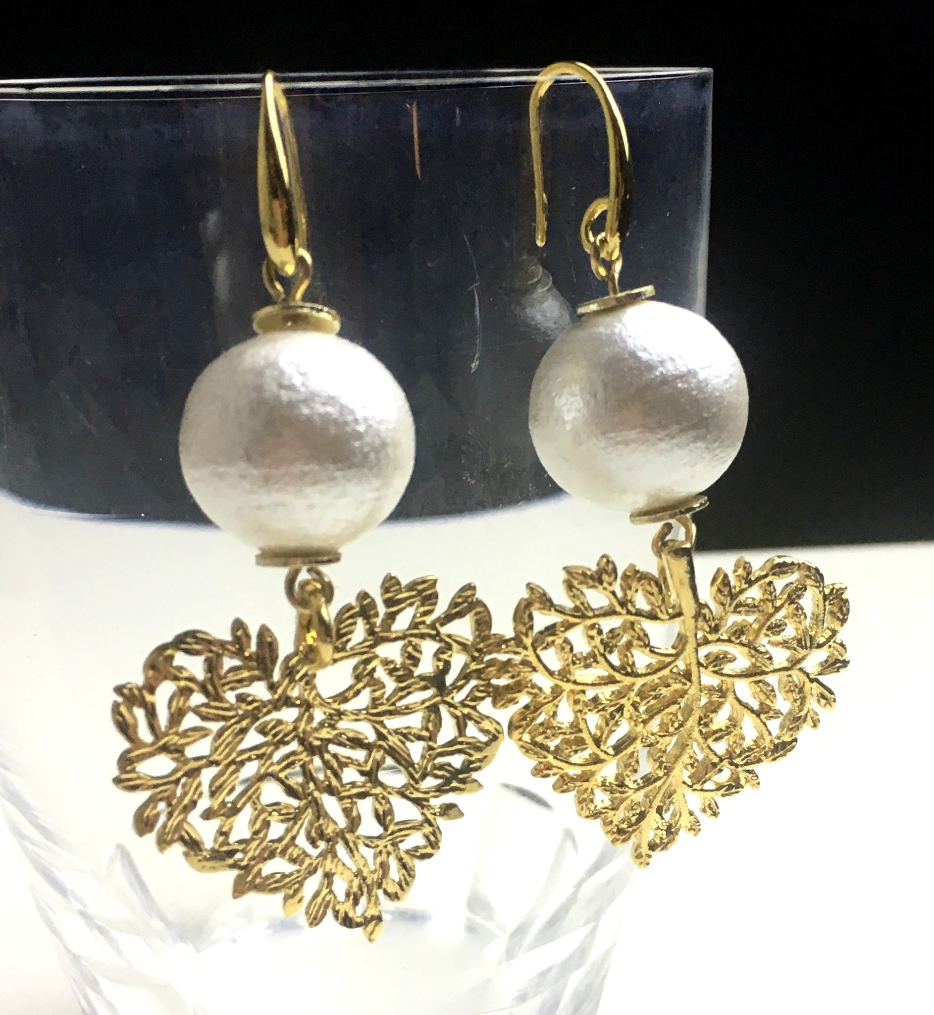 Handgemaakte oorbellen van katoenparels en en blad in de vorm van een hart aan vergulde oorstekers. Voor wie van apart houdt en 'n tikje statement ! Lees meer